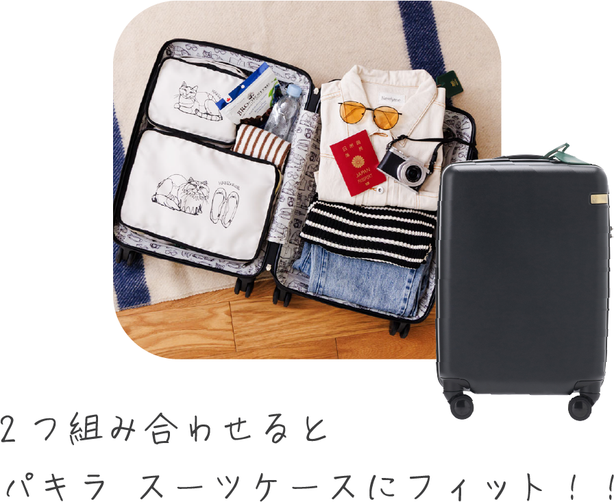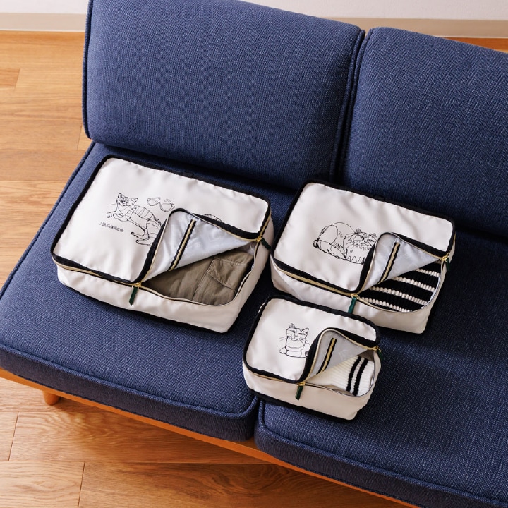 旅行に便利なパッキングポーチや、何かと使えるフラットポーチセットなど、自分用にはもちろん、ネコ好きな方へのギフトにも◎