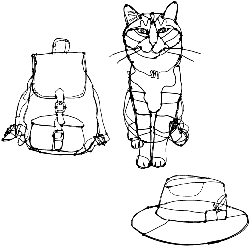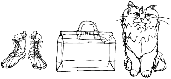 ネコや旅にまつわるワイヤーアートを柄に落とし込み、