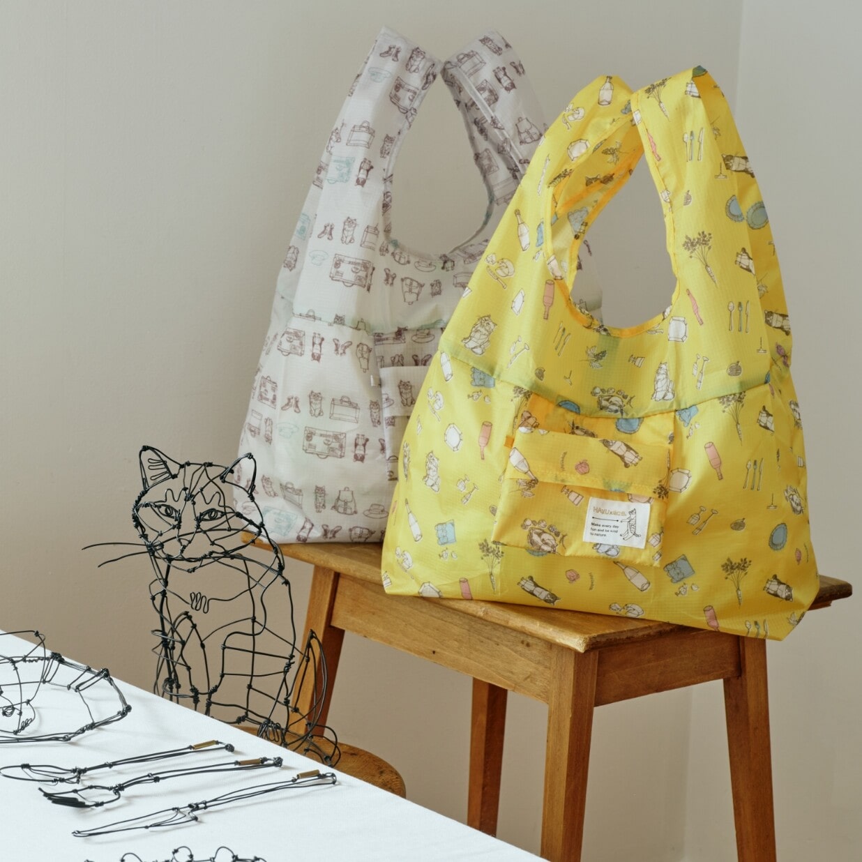 HAyUのワイヤーアートから起こした5パターンのオリジナル柄で、選ぶのが楽しいマルシェバッグ。