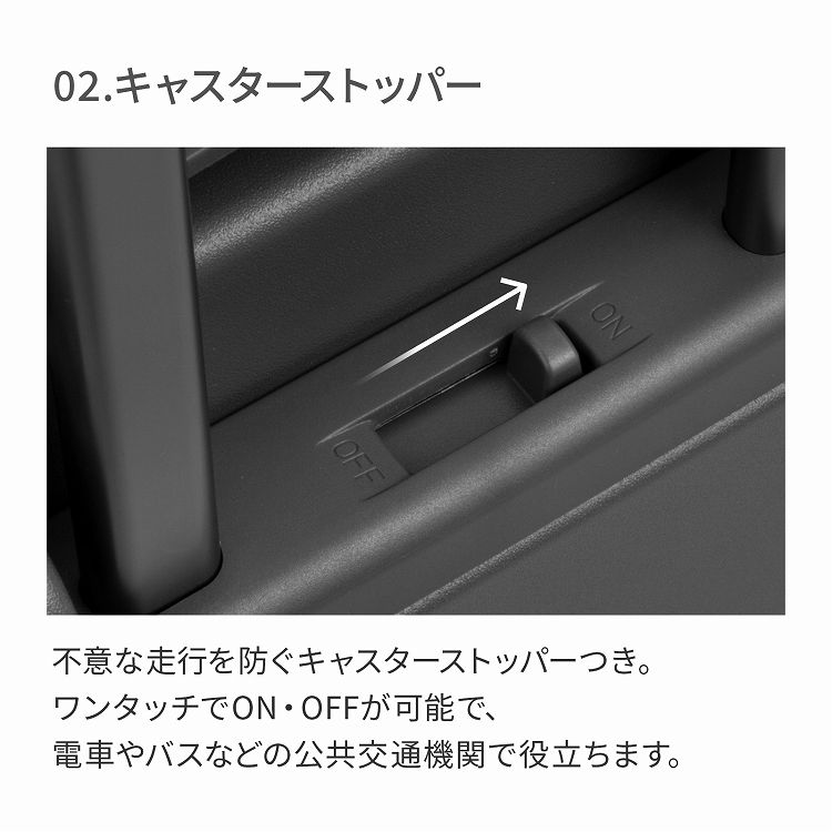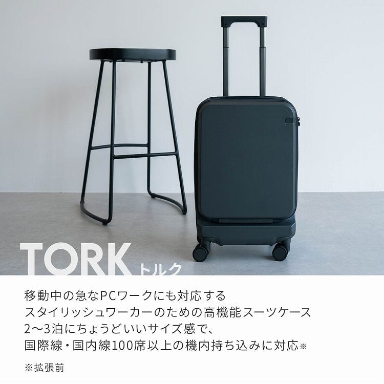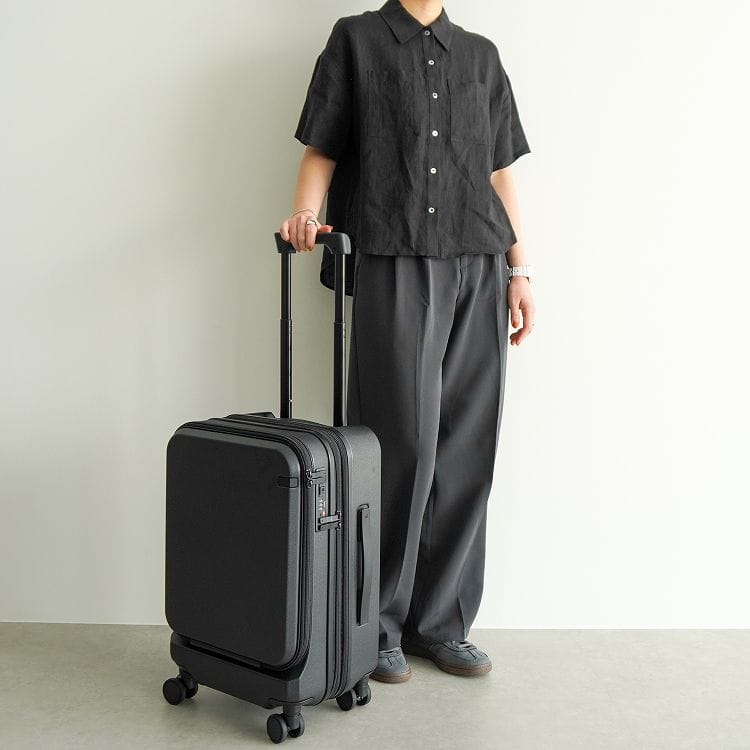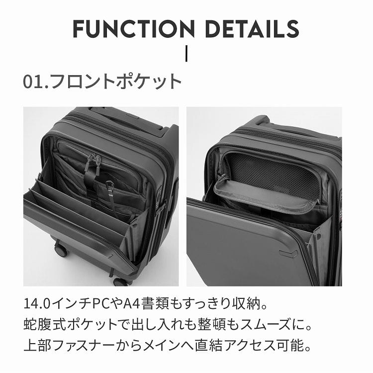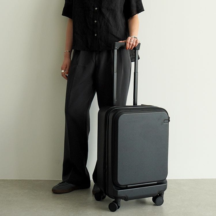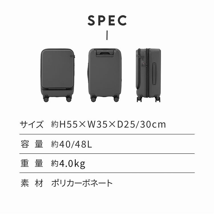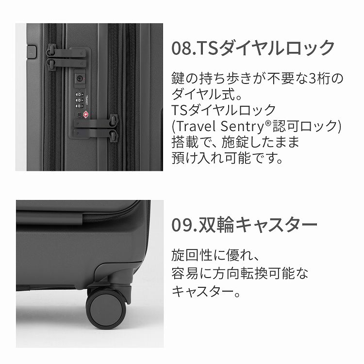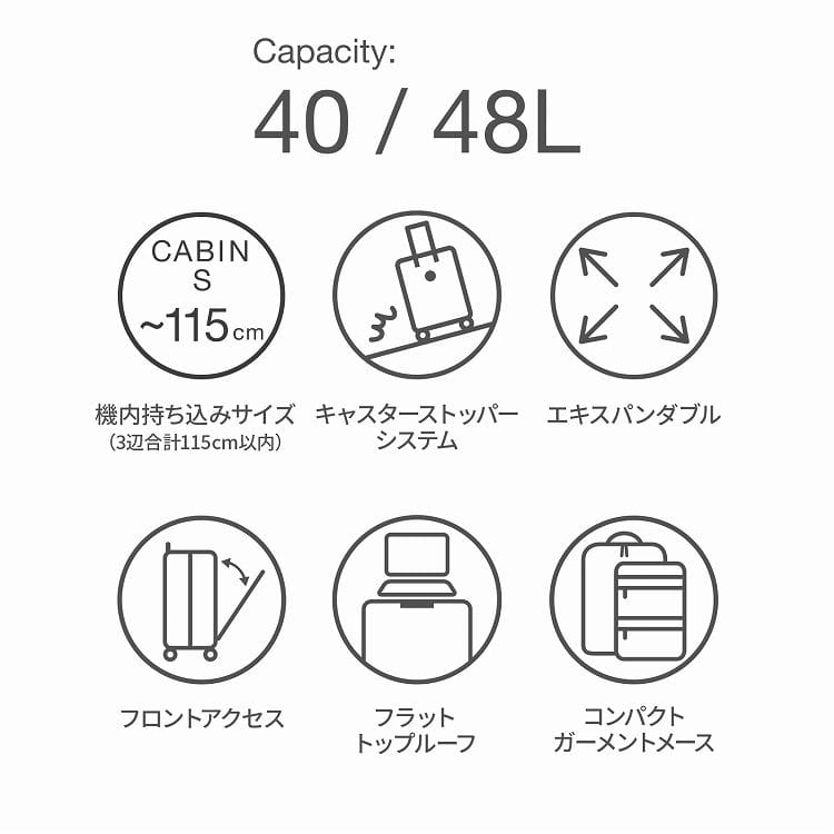 - 4輪(双輪)/TSダイヤルファスナーロック/キャスターストッパー/フロントオープンポケット(メイン気室へのアクセスは不可)/エキスパンダブル/コンパクトガーメントケース・オーガナイザーパネル付属/国内100席以上・国際機内持込み