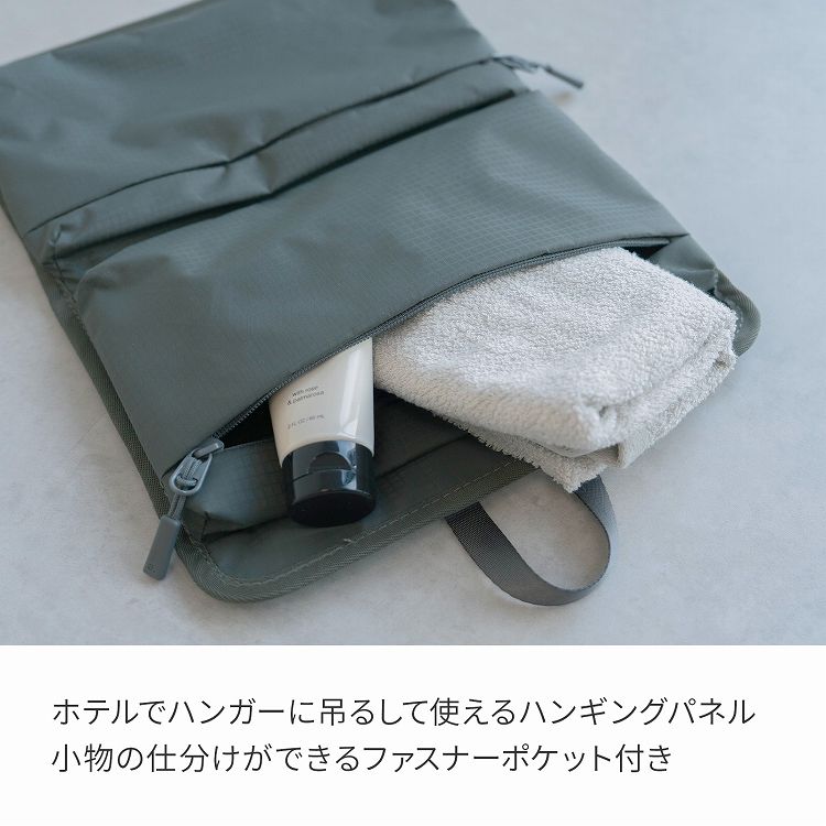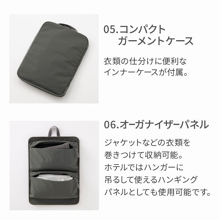 双輪キャスターやエキスパンダブル機能に加え、衣類の仕分けができるオーガナイザーパネル入りのコンパクトガーメントケースが付属。