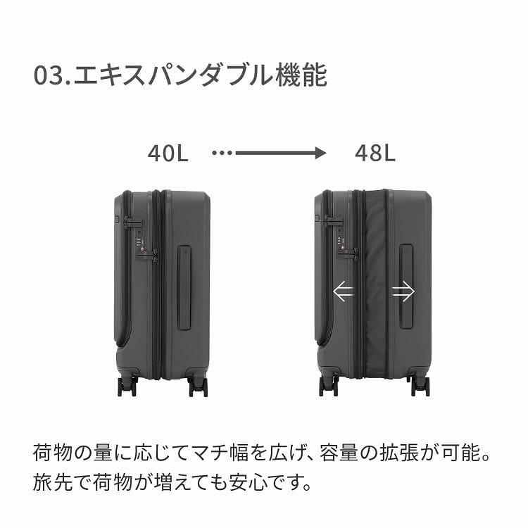 - ※拡張時に一部航空会社のサイズ規定を超過する場合がございます。航空会社によって規定が異なりますので、詳しくはご購入前にご利用の航空会社へご確認下さい。