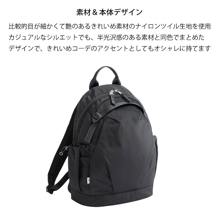 カジュアルなシルエットでも、半光沢感のあるナイロンツイル素材と同色でまとめたデザインで、きれいめコーデのアクセントとしてもオシャレに持てます。