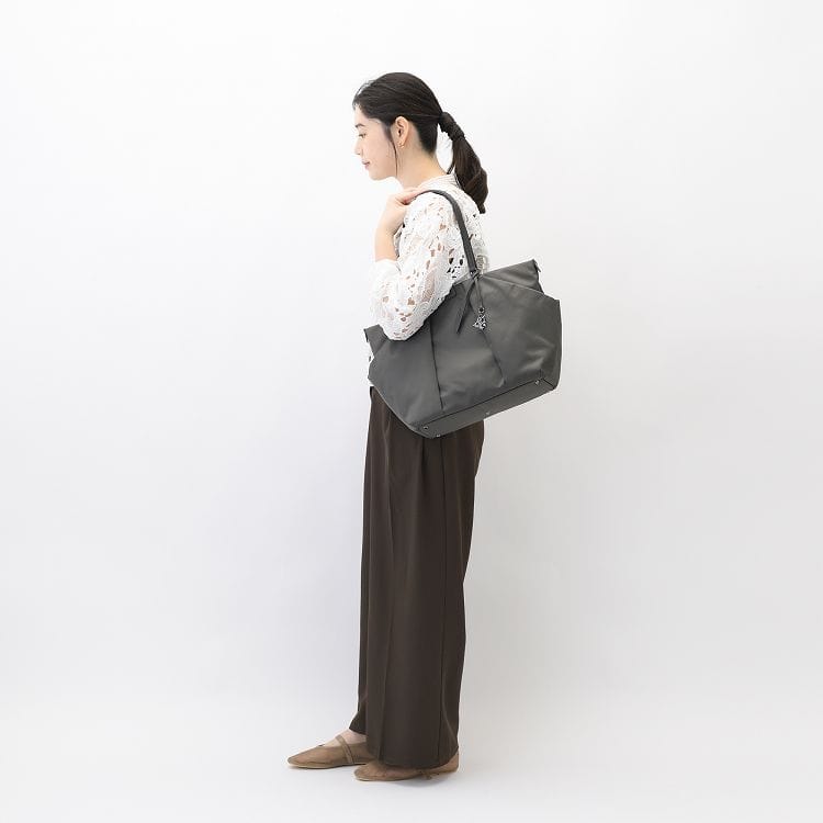 デザインは、ゆったりふんわりとしたシルエットに仕上げました。書類やタブレットはしっかりと入りつつも、アフターファイブを意識したスポーティカジュアルなコーティネートでも浮かずに持てます。