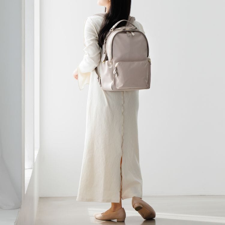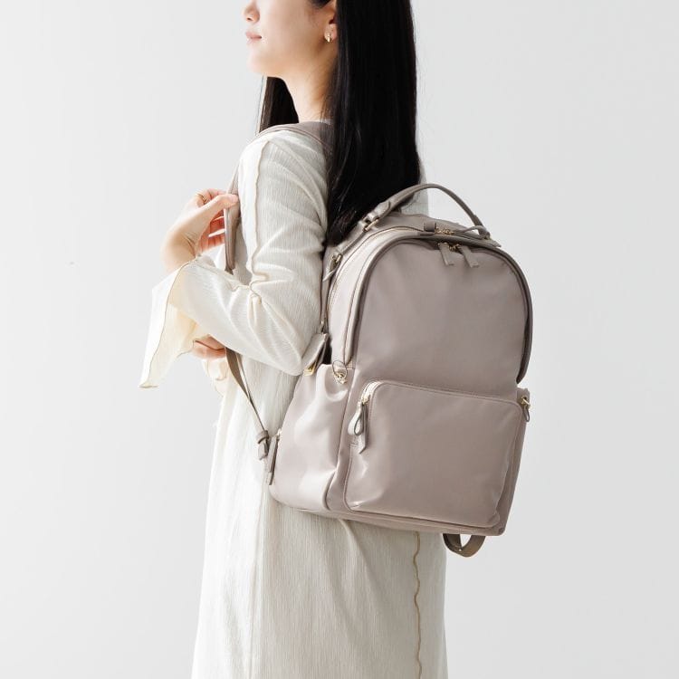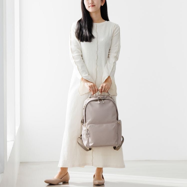 上品なパイピングとリボンディティールが特徴のきれいめリュック。