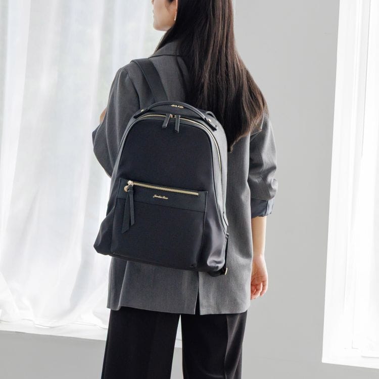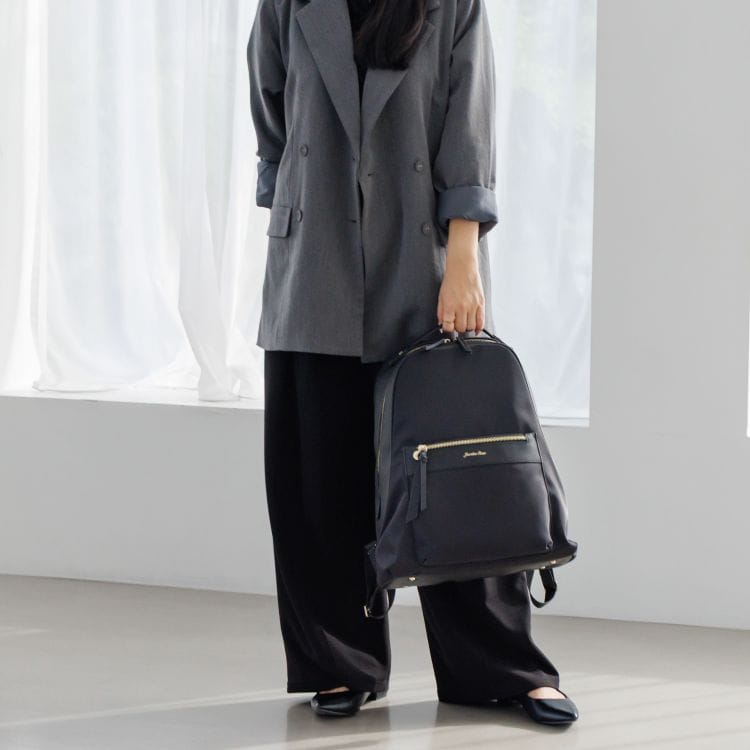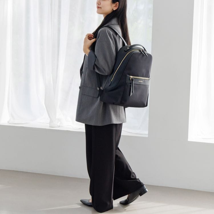 フロントのロゴやファスナーでポイント使いしたゴールドのカラーリングで華やかな印象に。
