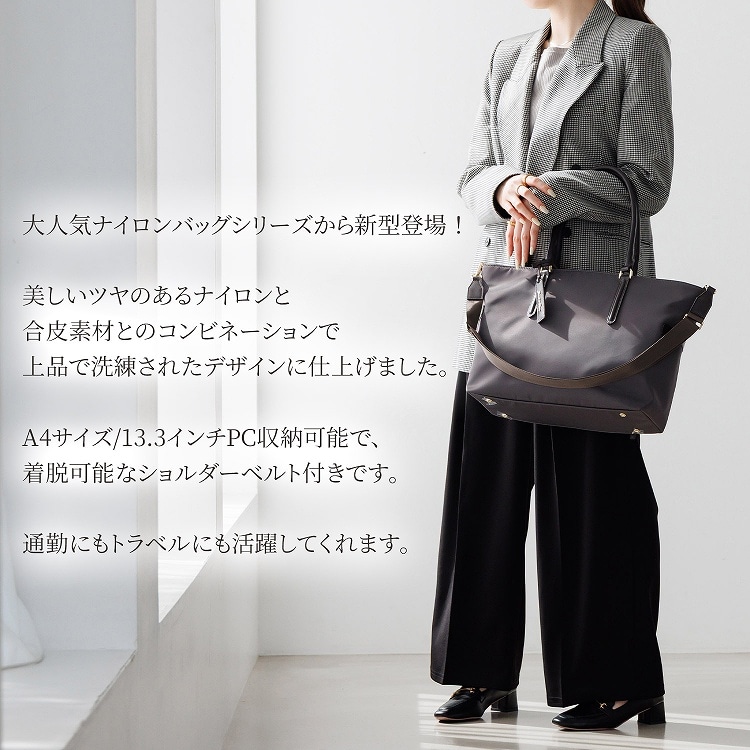 美しいツヤのあるナイロン素材を使用した台形トートバッグ。