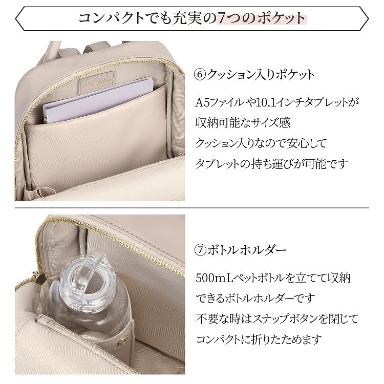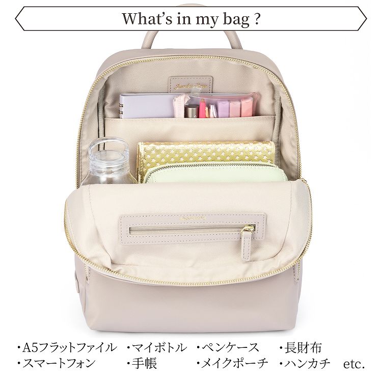 メイン収納スペースには、A5サイズの手帳やメイクポーチ、500mLペットボトルに長財布など