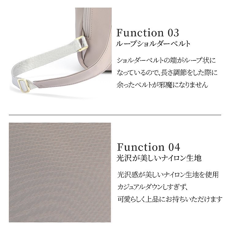 光沢感が上品なナイロン素材に、ゴールドのパーツ使いが華やかな印象に。