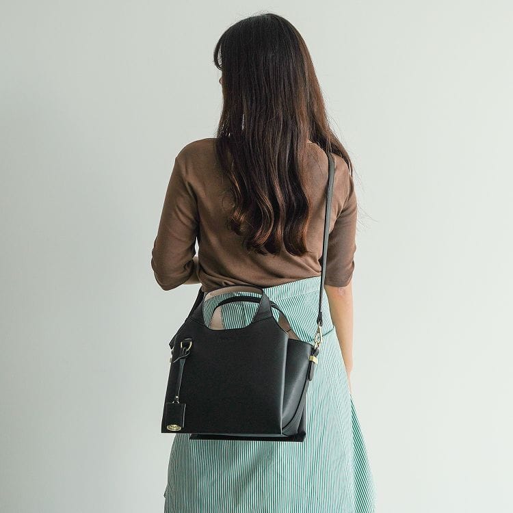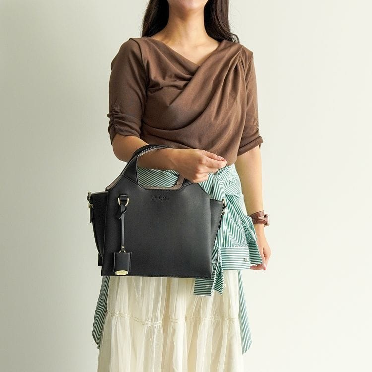 柔らかなラウンド感とシャープな直線が融合した上品なくり手のハンドバッグ。