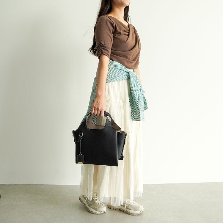 特徴的なシルエットと、さりげないバイカラーデザインでこなれ感のあるアイテムに仕上げました。