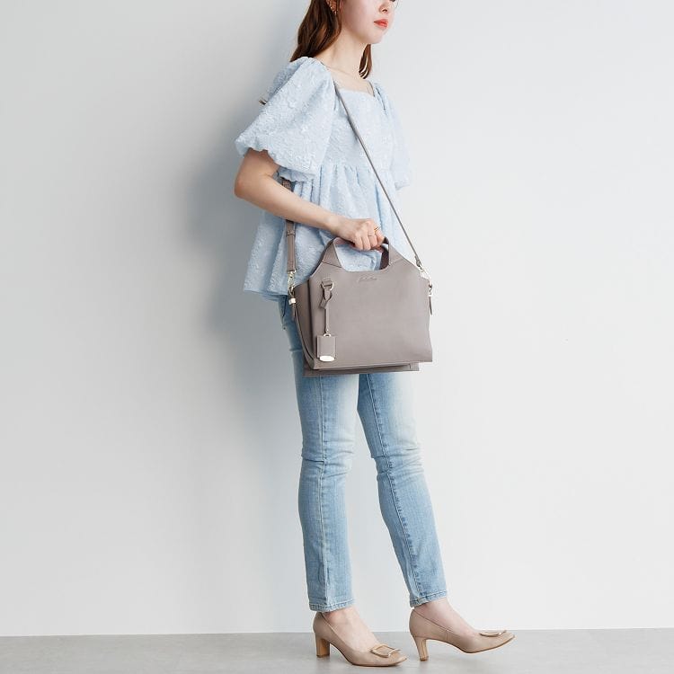 柔らかなラウンド感とシャープな直線が融合した上品なくり手のハンドバッグ。