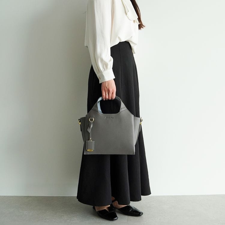 特徴的なシルエットと、さりげないバイカラーデザインでこなれ感のあるアイテムに仕上げました。