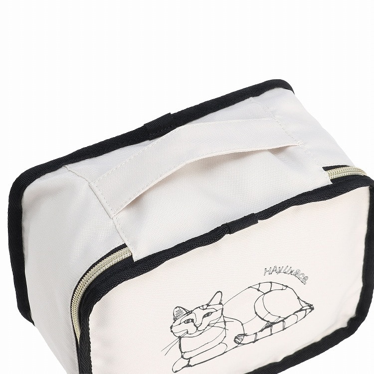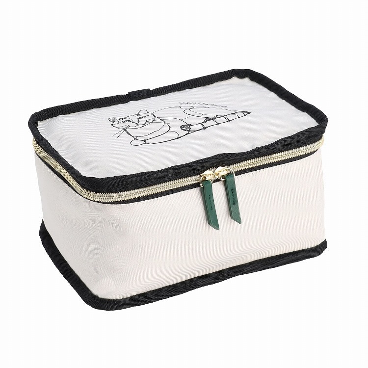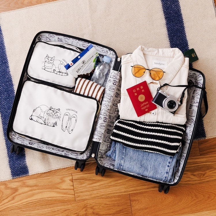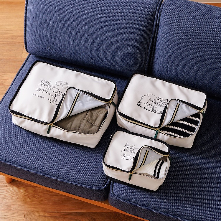 香箱座りのネコがプリントされたパッキングポーチSは、薄手の衣類や下着、靴下などの収納に便利です。