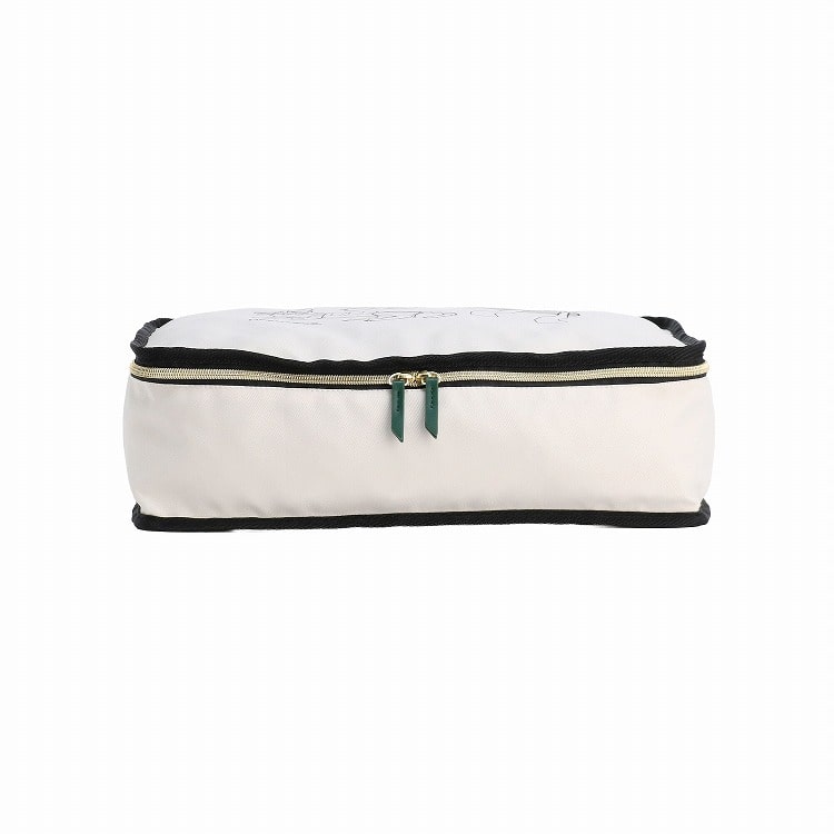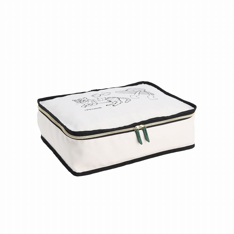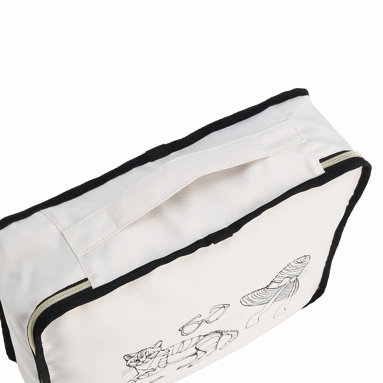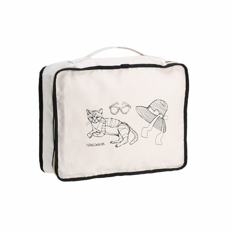 リラックスしたネコがプリントされたパッキングポーチLは、厚手のニットなどもしっかり入るサイズ感。