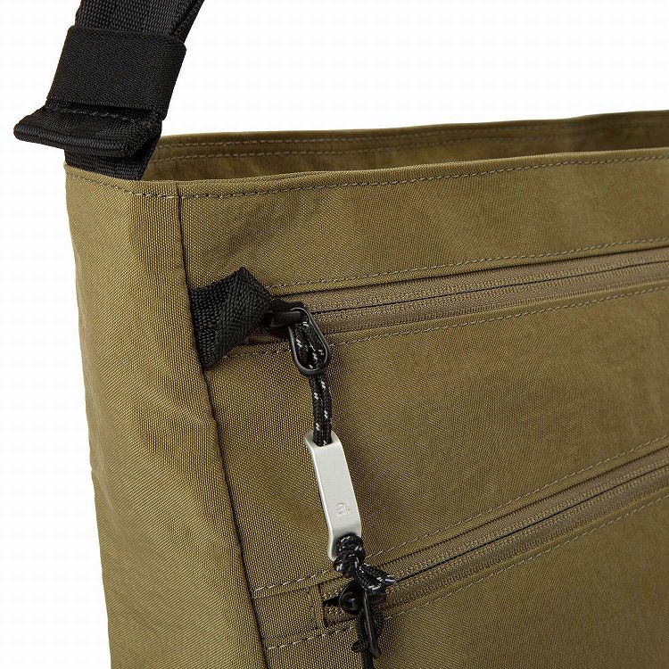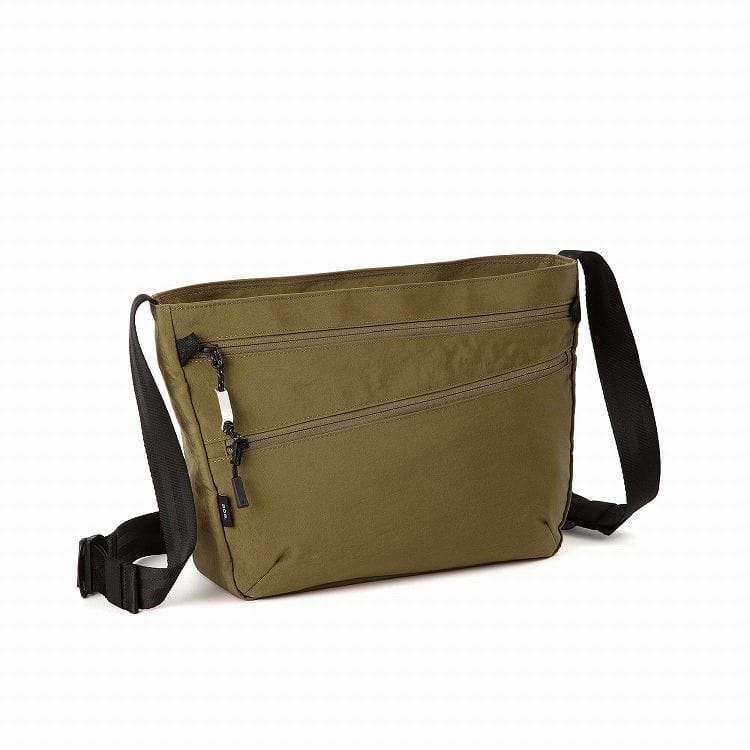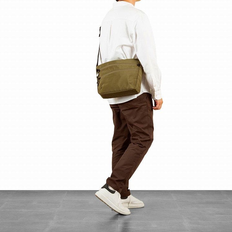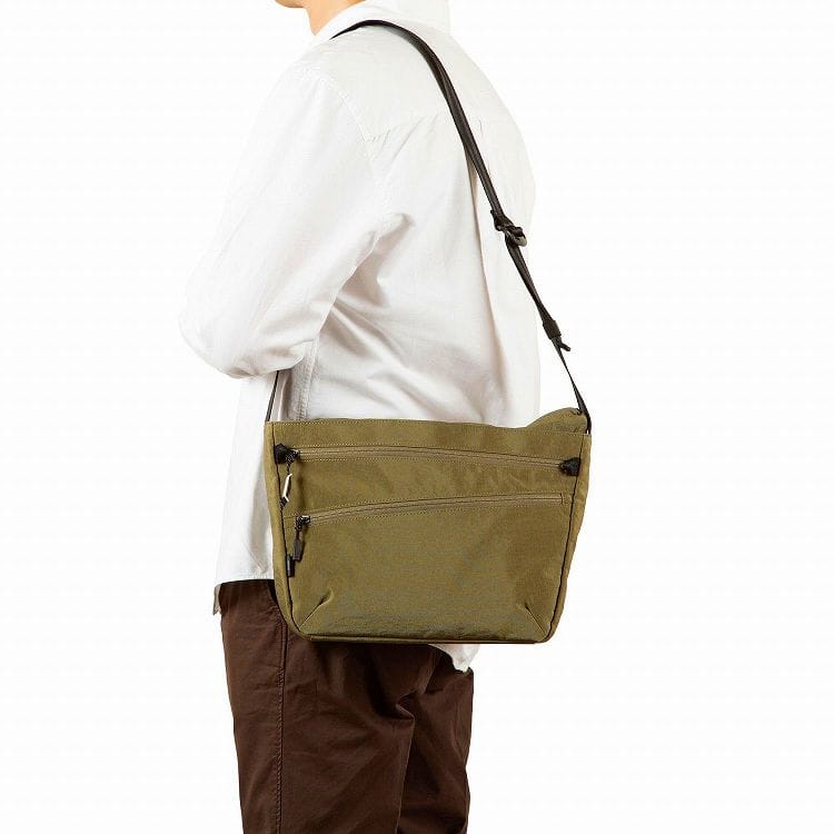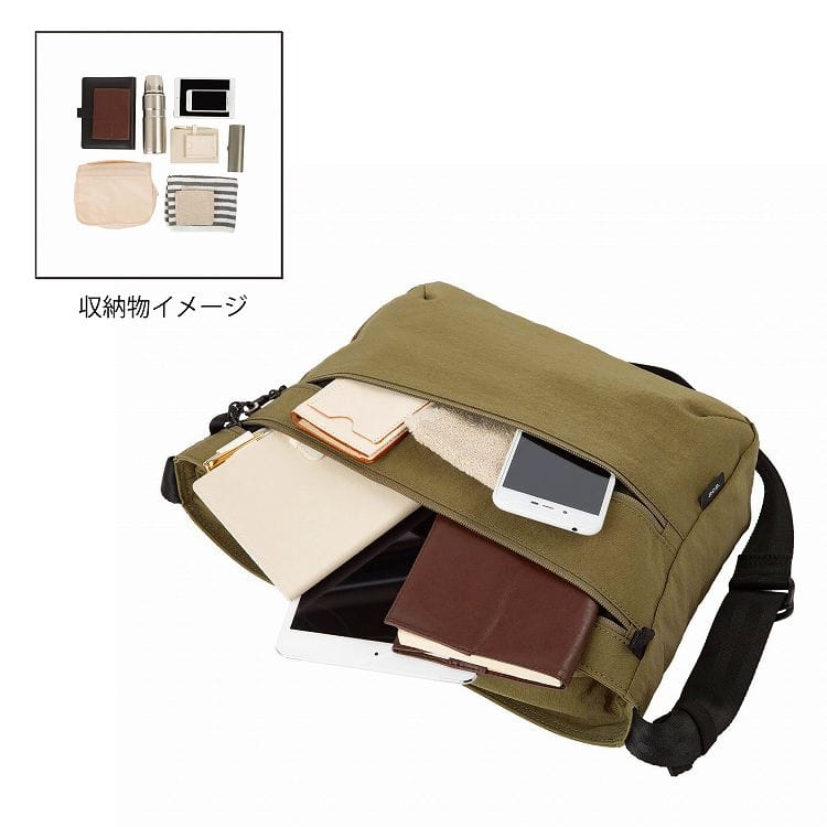 ダブルフロントポケットが特徴のA4サイズショルダーバッグ。