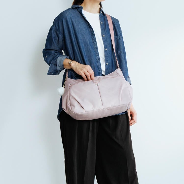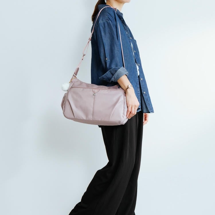 長財布やスマホ、飲み物などの身の回り品に加えて、羽織ものも収納できる大きめサイズです。