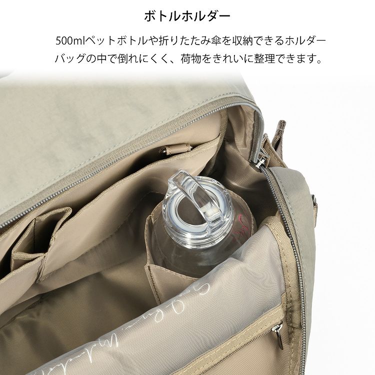 内装には、中身が見やすいシースルーポケット、書類用のフラットポケット、PC周辺機器向けのミニポケット、ボトルホルダーなど、使いやすさにこだわった収納が揃っています。