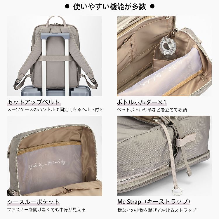 - A4ファイル収納/PC収納(14.0inch)/シースルーポケット/他ポケット多数/Napping pl.(スマートフォンポケット)/Me Strap(キーストラップ)/セットアップ機能