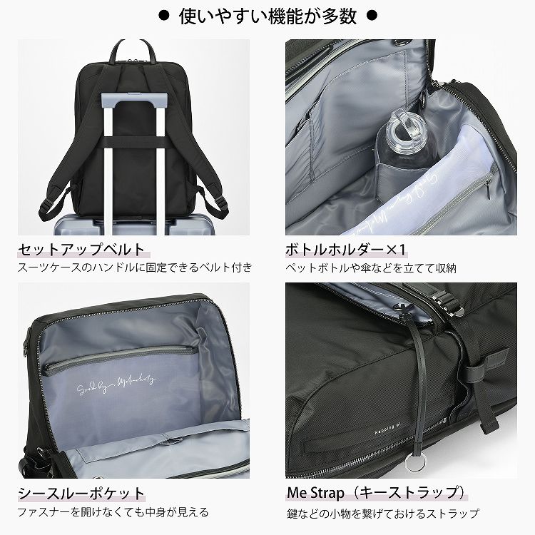 - B4ファイル収納/PC収納(15.6inch)/シースルーポケット/他ポケット多数/Napping pl.(スマートフォンポケット)/Me Strap(キーストラップ)/セットアップ機能