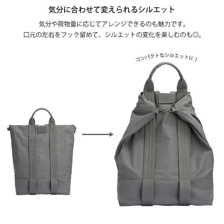 本体上部の左右を折って、コンパクトにフォルムをアレンジできるフック付き。