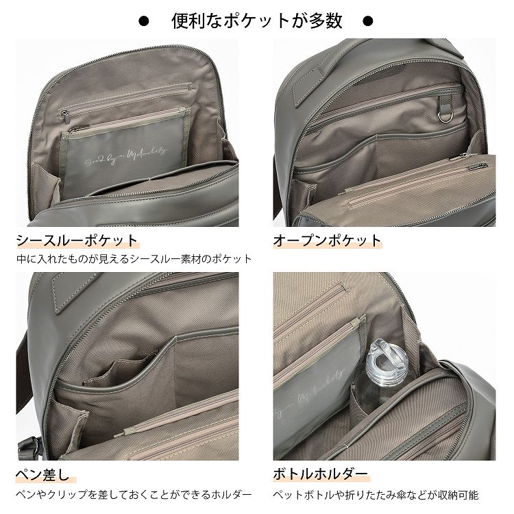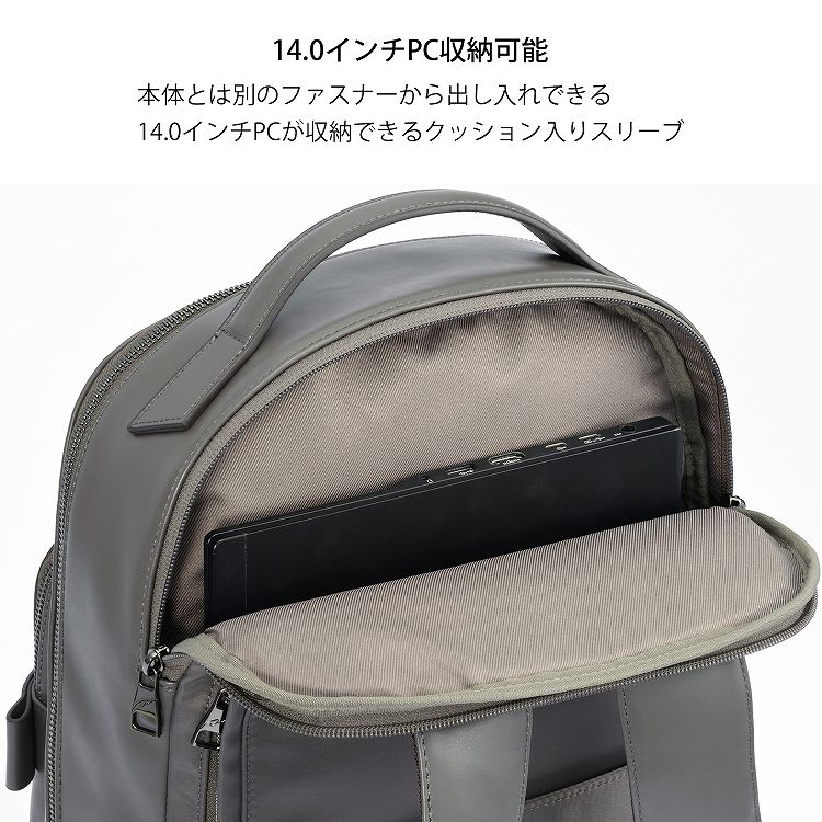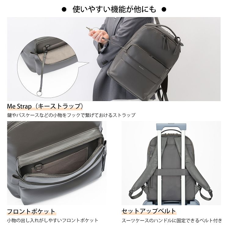 - 2気室/A4ファイル収納/PC収納(14.0inch)/シースルーポケット/他ポケット多数/Napping pl.(スマートフォンポケット)/Me Strap(キーストラップ)/セットアップ機能