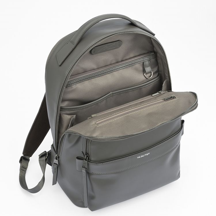 コーディネートを選ばないミニマルデザインながら、充実のポケットやボトルホルダーなど、W&.Day/Nightらしい収納の工夫が満載のリュックです。