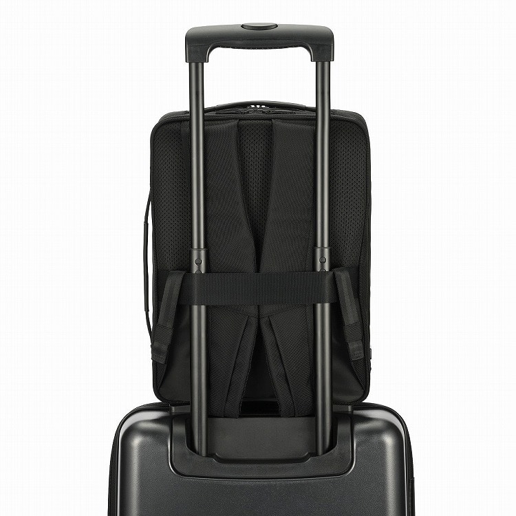 リュック背面へはスーツケースのハンドルに固定可能なセットアップベルトを設置。