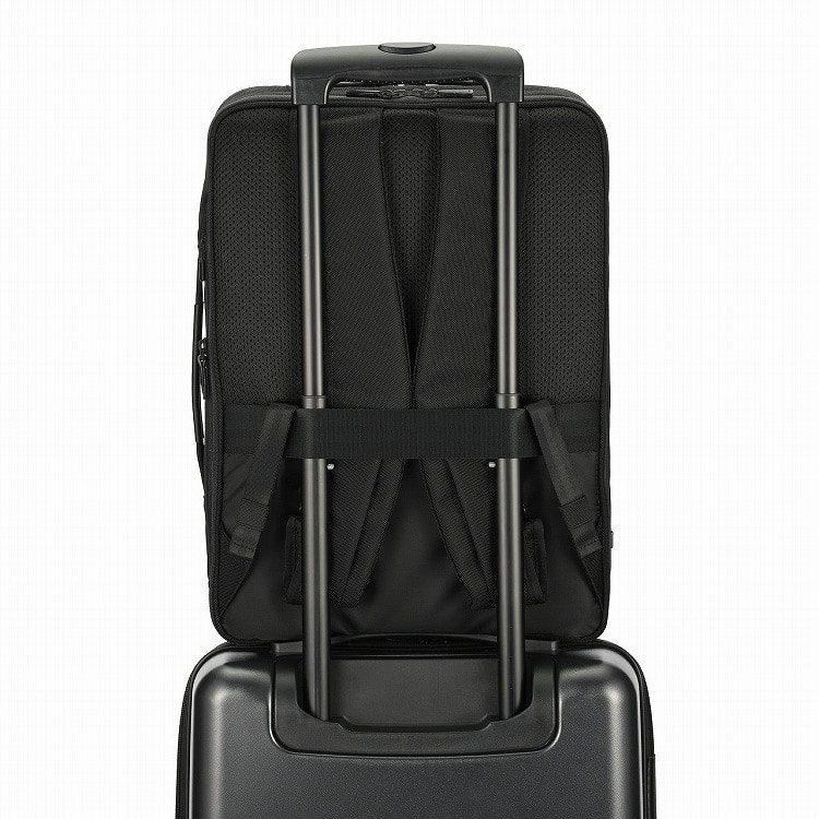 リュック背面へはスーツケースのハンドルに固定可能なセットアップベルトを設置。