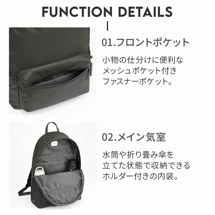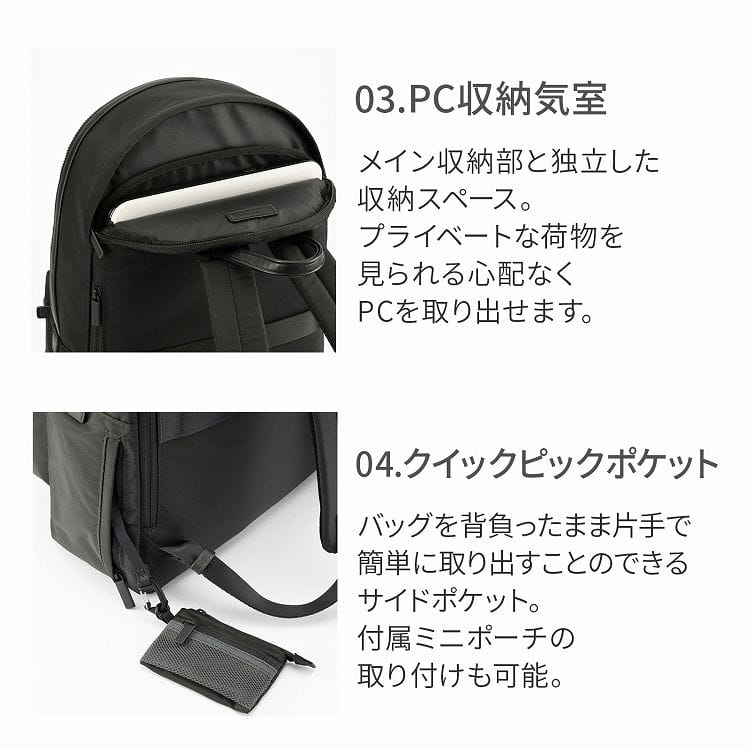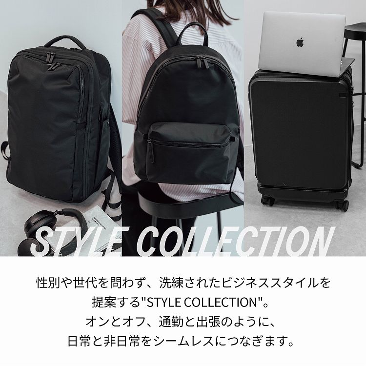 性別や世代を問わず、洗練されたビジネススタイルを提案する"STYLE COLLECTION"から誕生した、通勤にも出張にも気軽に使いやすい、シンプルでスタイリッシュなデイパックシリーズ。背負ったまま使えるサイドポケットに取り付けて使用できるミニポーチ付きです。