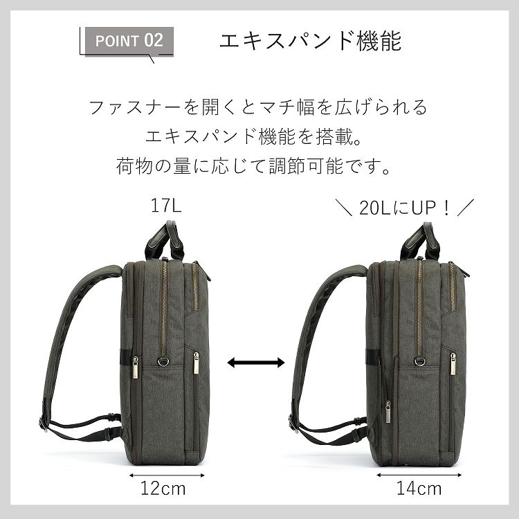 ファスナーを開くことで、マチ幅を拡げて容量を増やせるエキスパンド機能を採用。