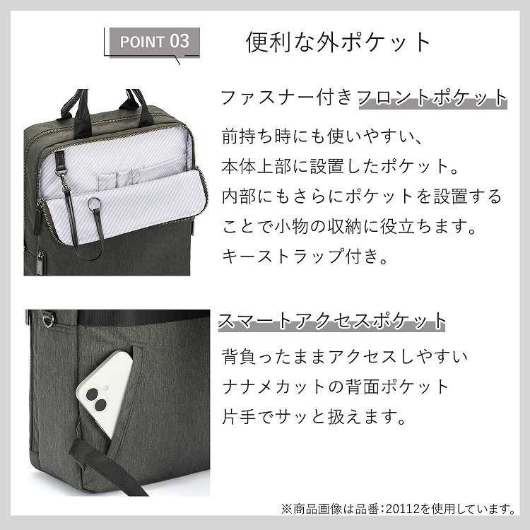 電車内などで前持ちした際も邪魔になりにくい、スリムでコンパクトなシルエットです。