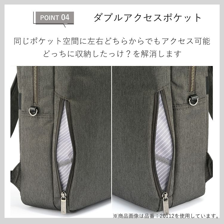 背面にファスナー付きのポケットを配置。貴重品の管理などにも役立ちます。