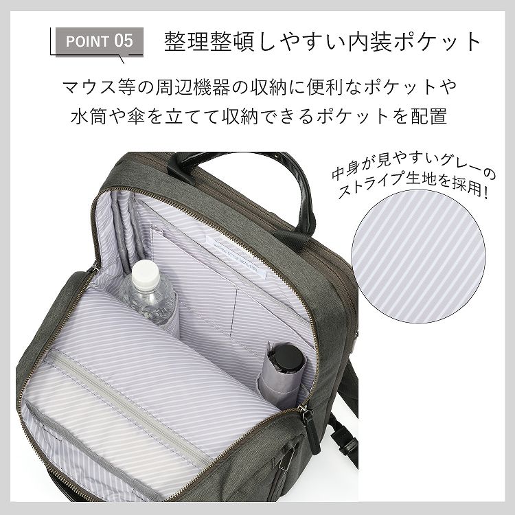 薄暗い場所でも荷物を見つけやすいよう、明るいグレーのストライプ生地をメイン気室、フロントポケットに採用。