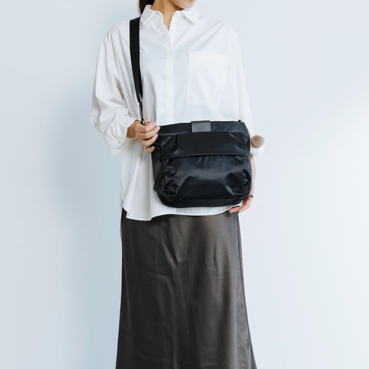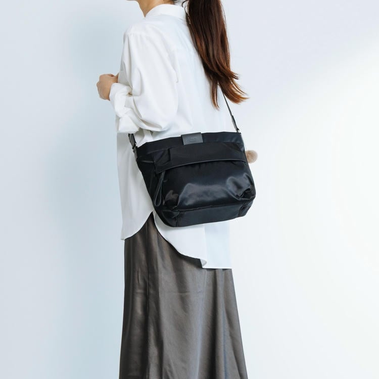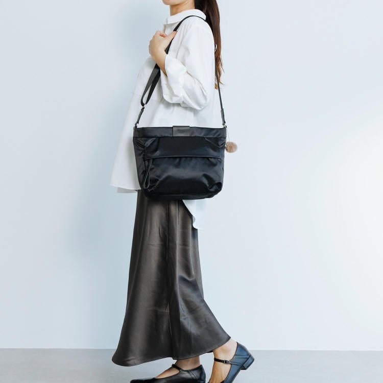 本体はリサイクルナイロンを使用し、光沢のあるサテン織りで仕上げたエシカルで良質な素材です。