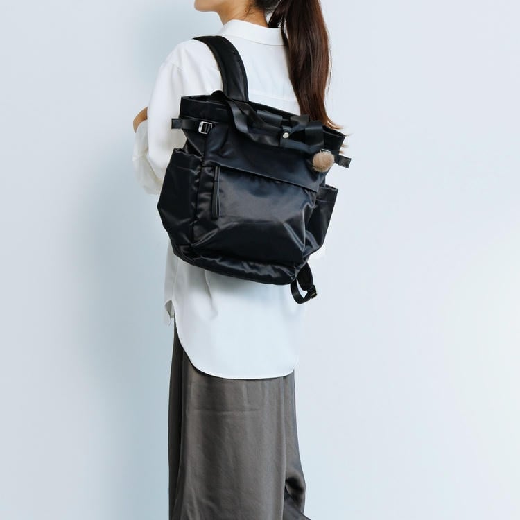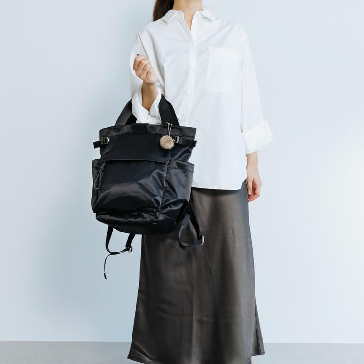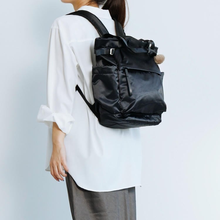 本体はリサイクルナイロンを使用し、光沢のあるサテン織りで仕上げたエシカルで良質な素材です。