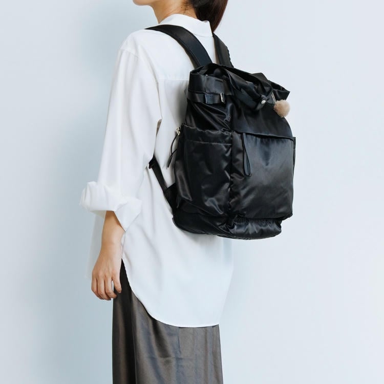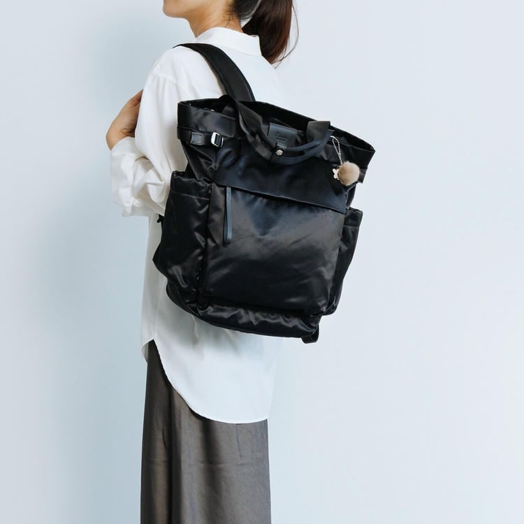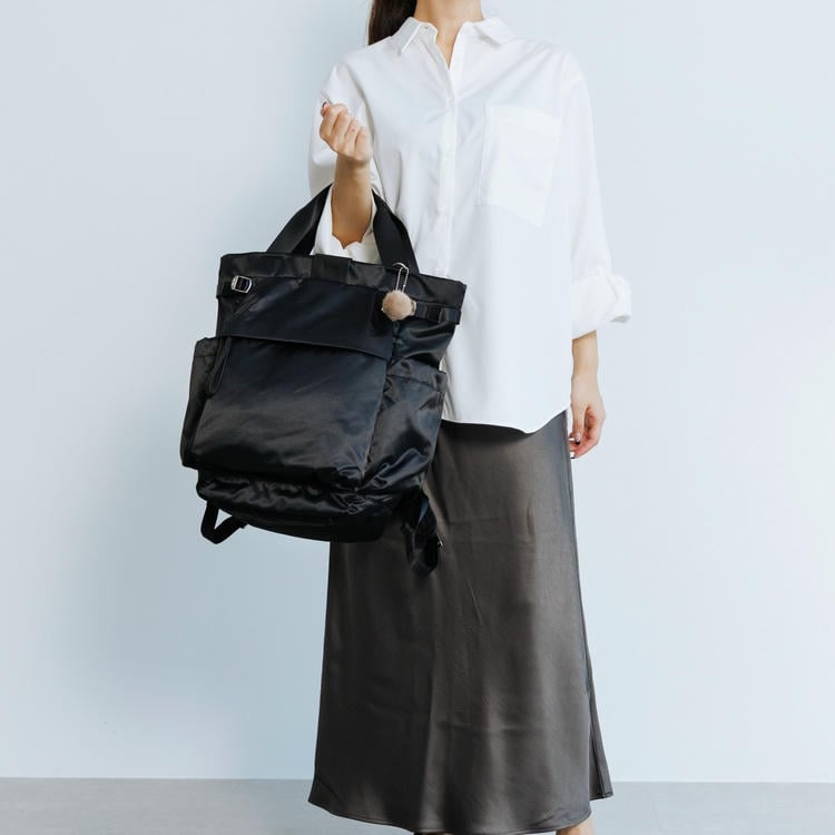 本体はリサイクルナイロンを使用し、光沢のあるサテン織りで仕上げたエシカルで良質な素材です。