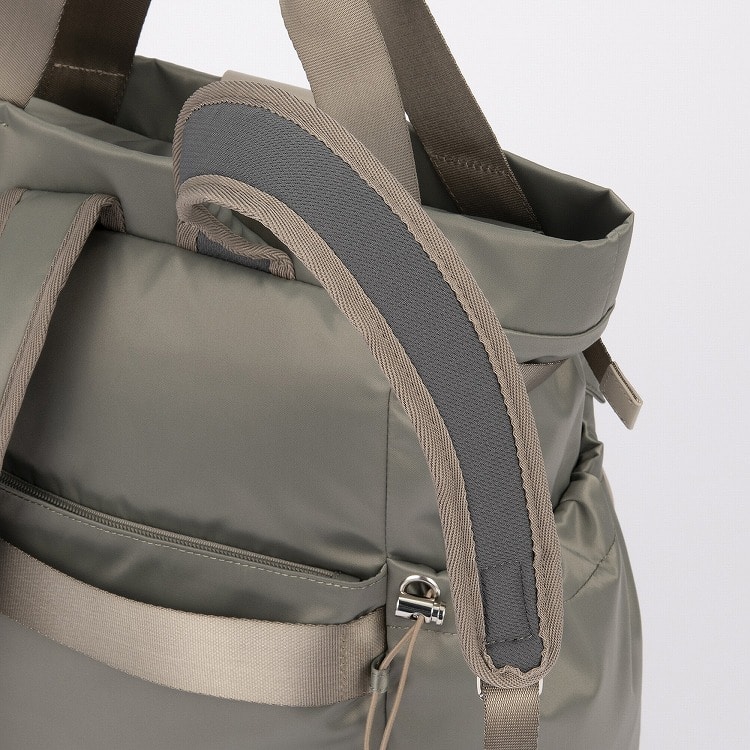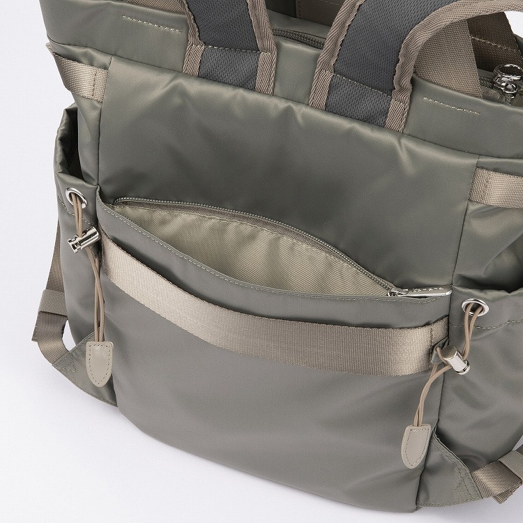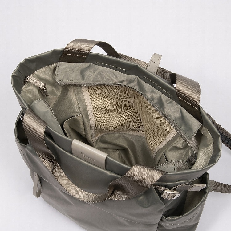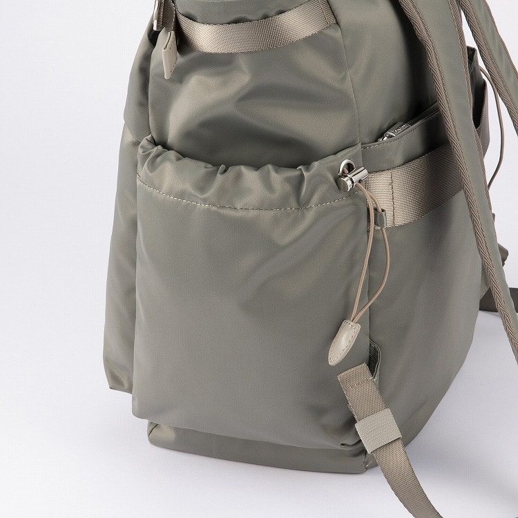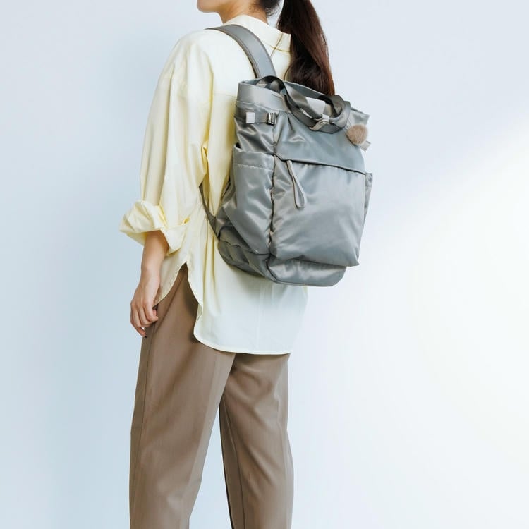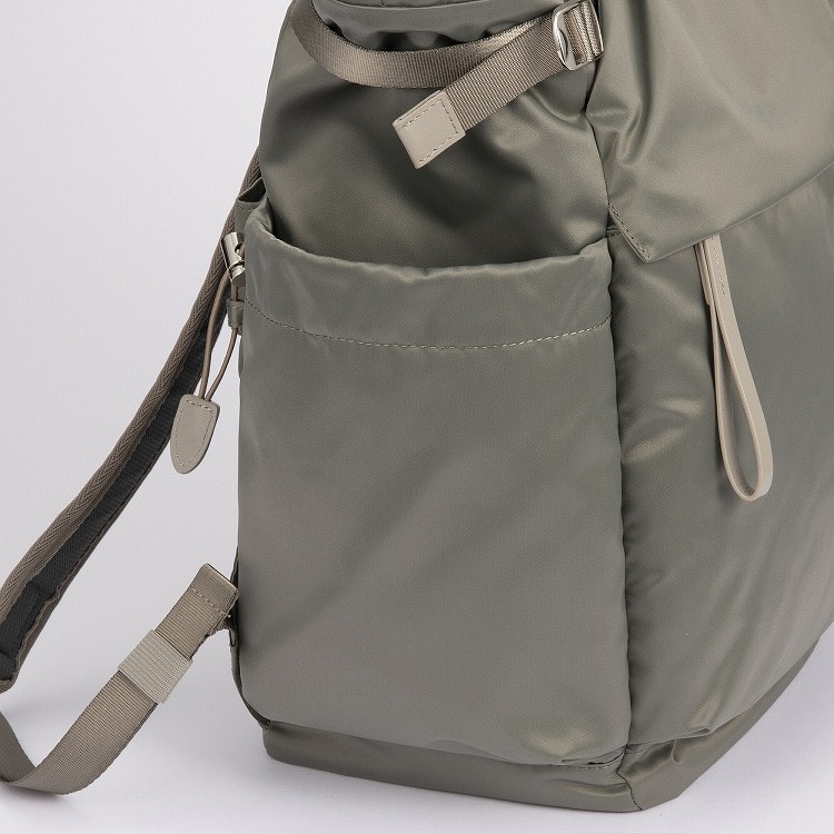 本体はリサイクルナイロンを使用し、光沢のあるサテン織りで仕上げたエシカルで良質な素材です。