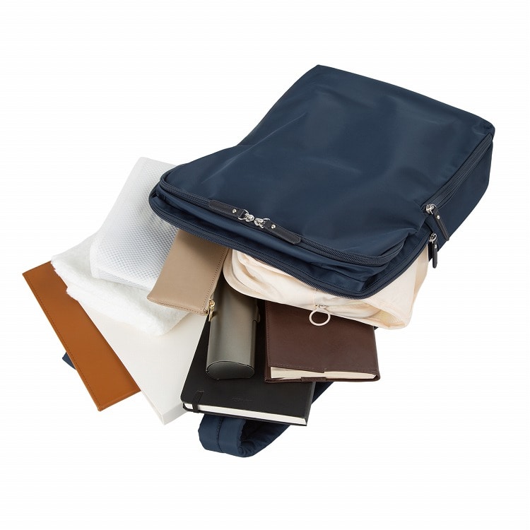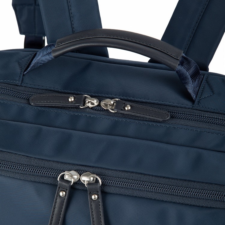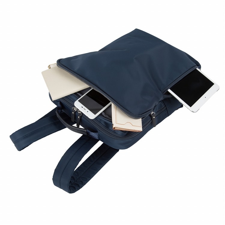 ・上部にはスマホやパスケースなどすぐに取り出したいモノの収納に便利なファスナーポケット。