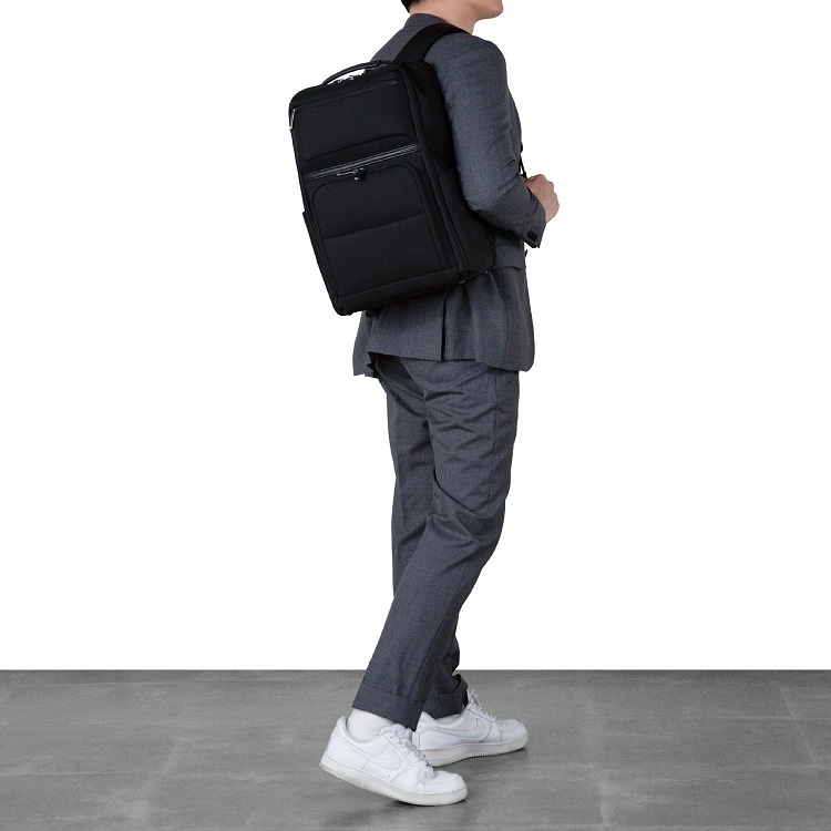 しっかりと自立する設計で、ビジネスバッグとしての機能性を高めています。