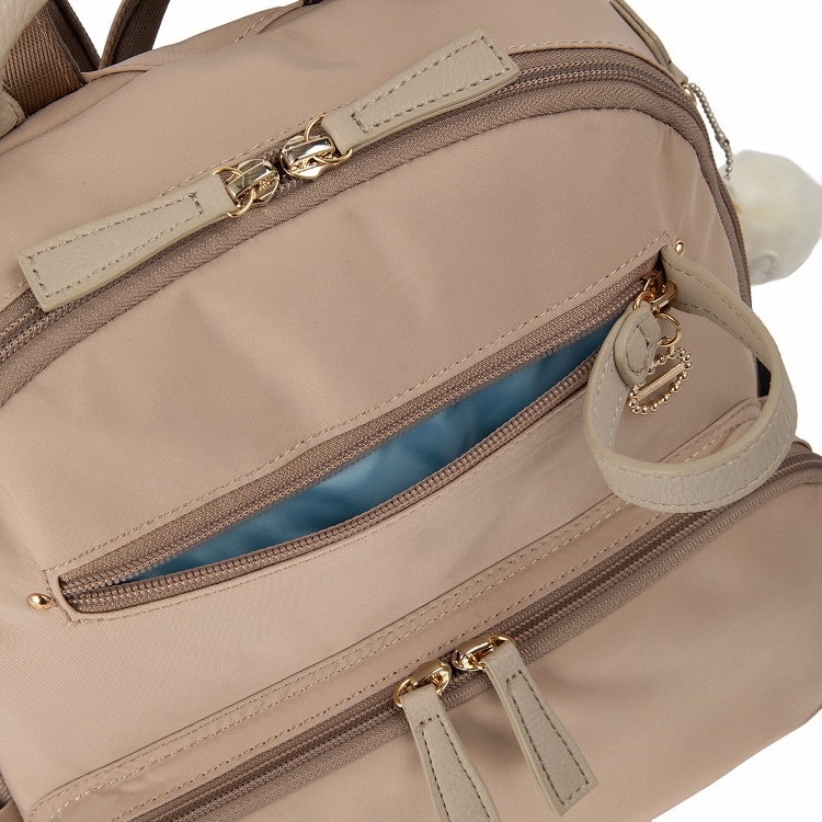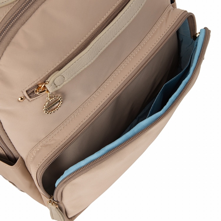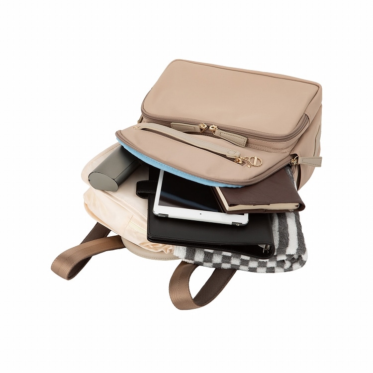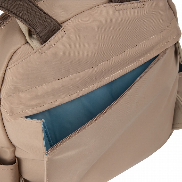口が大きく開き、荷物が出し入れしやすいシンプルな1気室の内装に、小物の出し入れに便利な大き目の前ポケット