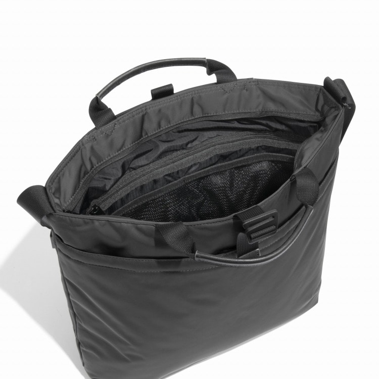 また、背面ポケット内にスマートフォンサイズのオープンポケットを配置しています。内装には13.3inch対応PCスリーブを備え、ビジネスシーンにも対応可能です。