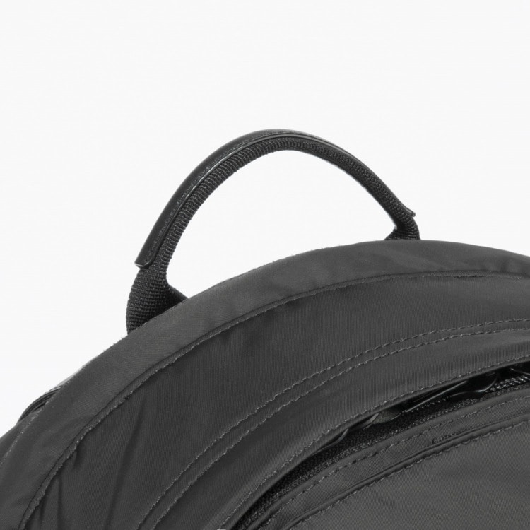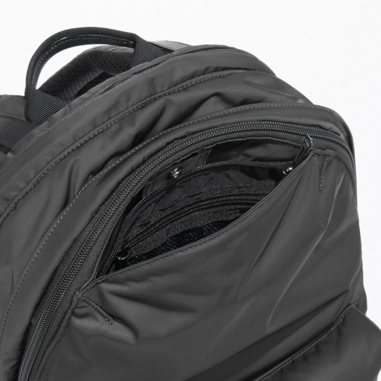 シンプルなデザインはそのままに、外から見えにくいフロント上部にトップポケット、両サイドにスマートフォンやパスケースを出し入れしやすいオープンポケットとファスナーポケットをそれぞれ配置しました。