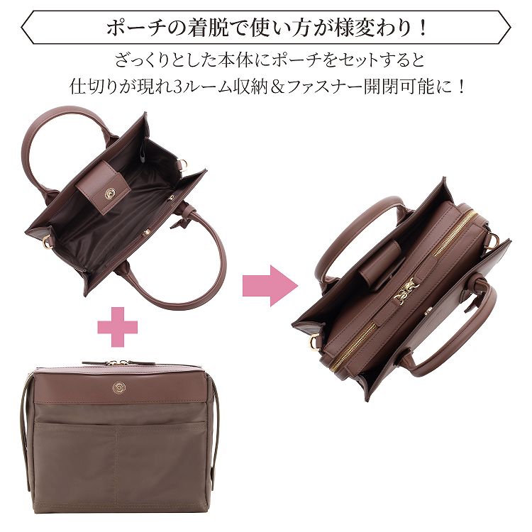 ポーチをセットすれば仕切りが現れ3ルームで荷物の整理整頓が可能。