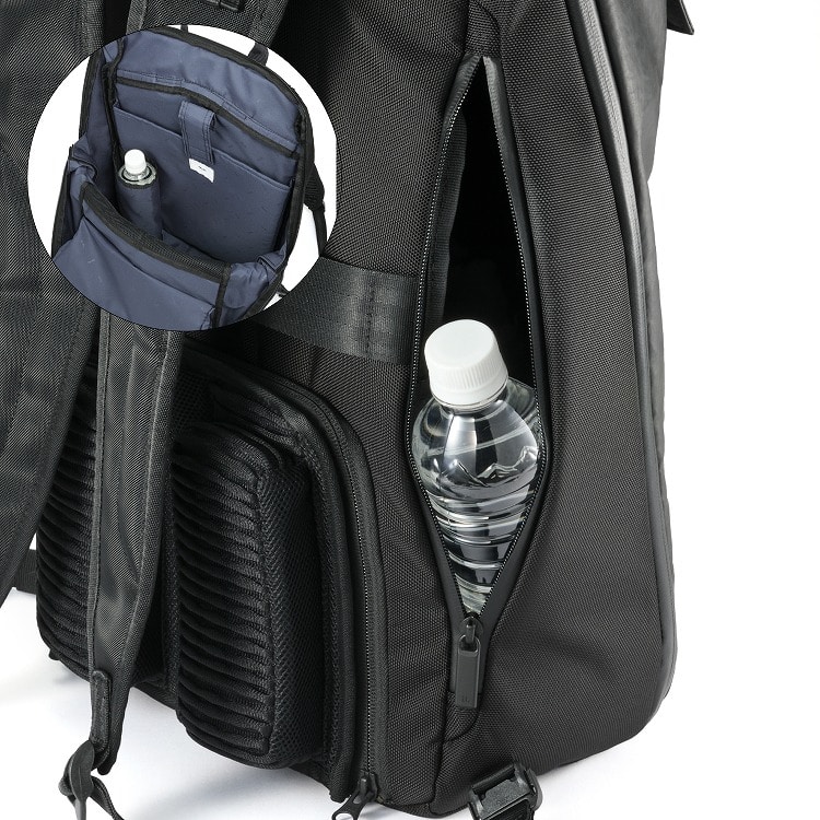 側面ファスナーと本体気室の双方から物の出し入れが可能なポケット。内側に吸水速乾機能のある素材を使用。