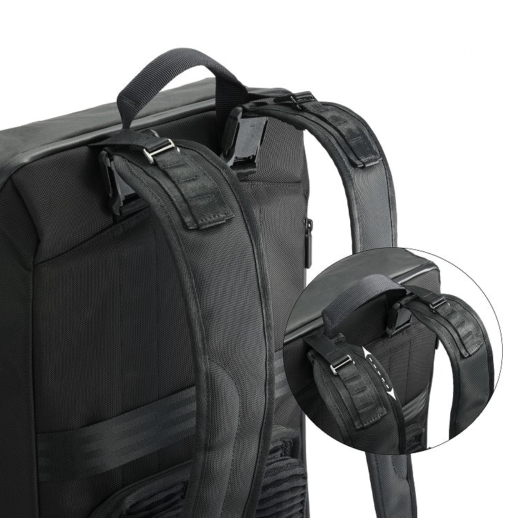リュック上部の前倒れを防ぐ為に、ハーネス上部に位置調整可能なロードリフターストラップを搭載。