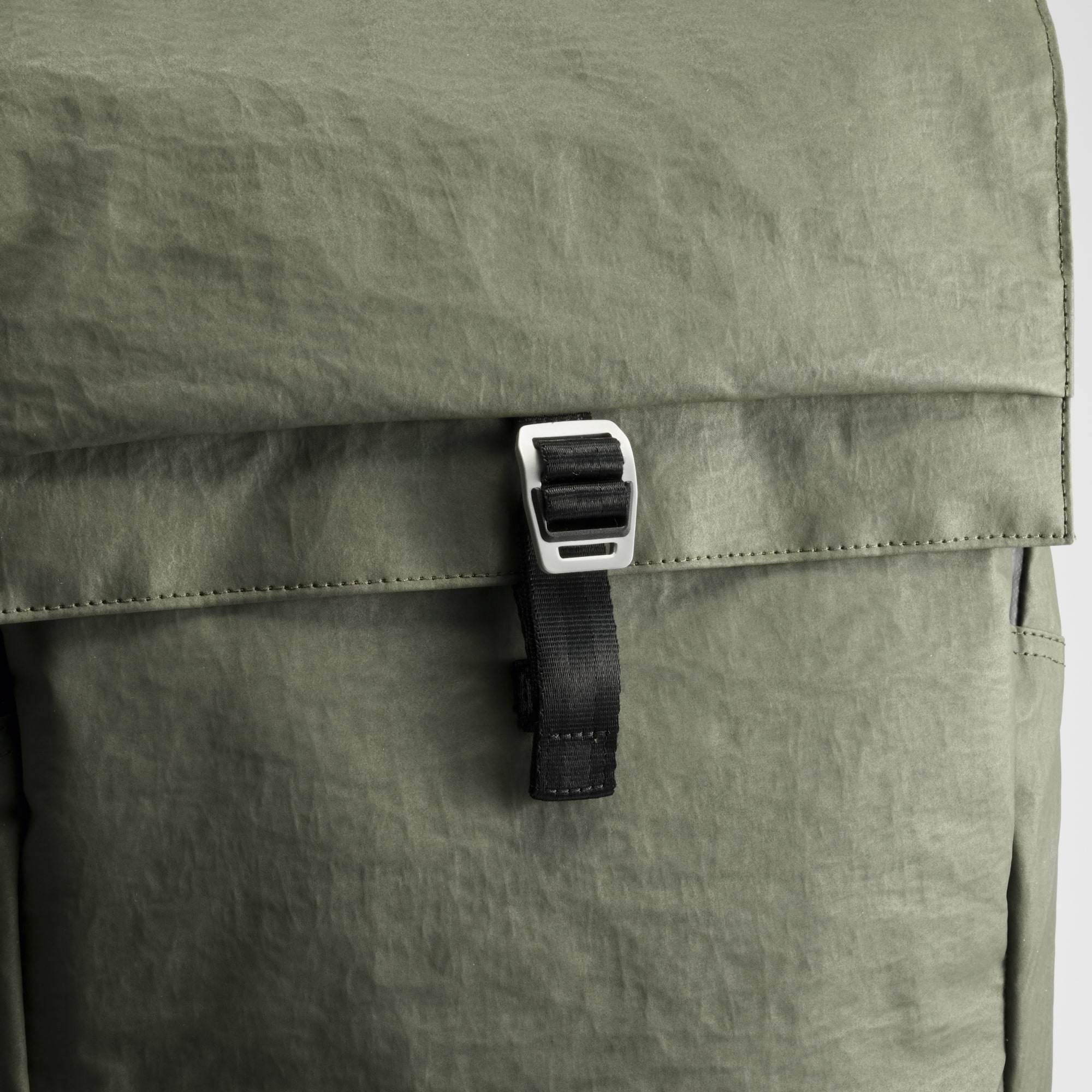 前面はコーティング素材を採用して、ポケットは雨カブセ付きで急な雨でも中身が濡れにくい構造。