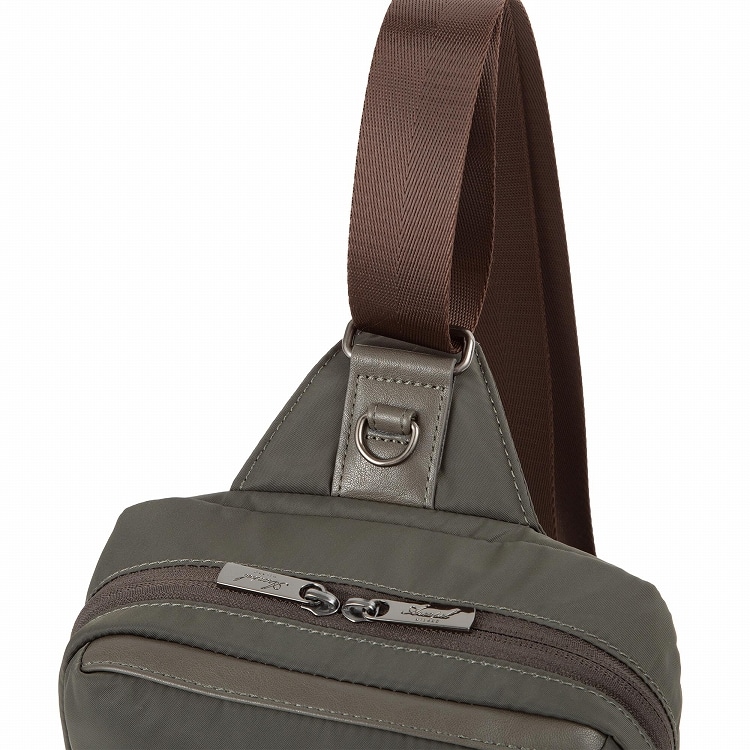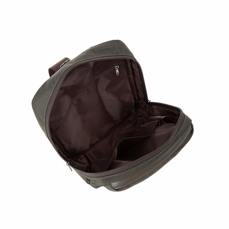 カジュアルなデザインの中にも、光沢感のあるナイロン本体生地とパーツに使用している合皮使いで上品さもあるバッグに仕上がっています。