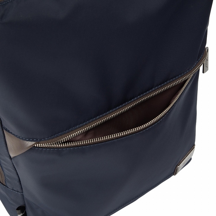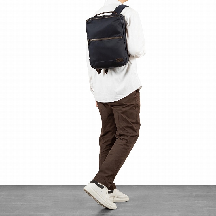 カジュアルなデザインの中にも、光沢感のあるナイロン本体生地とパーツに使用している合皮使いで上品さもあるバッグに仕上がっています。