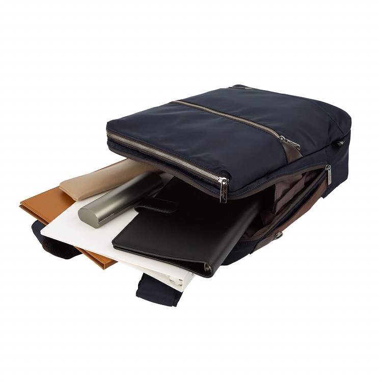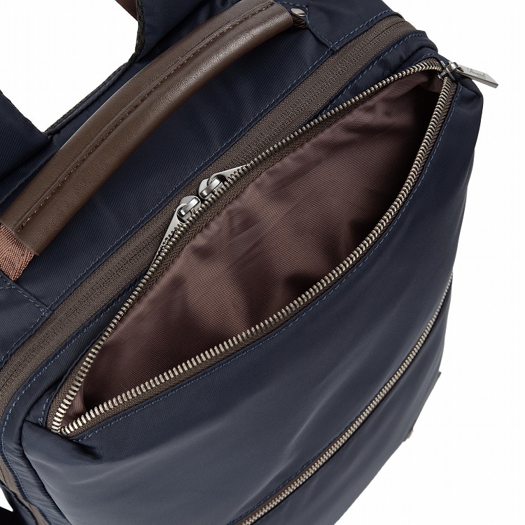 【内装】前側にはファスナーポケット×1。オープンポケット×2。ペン差し×2。背面側にはPCポケット、広めのオープンポケット×1。